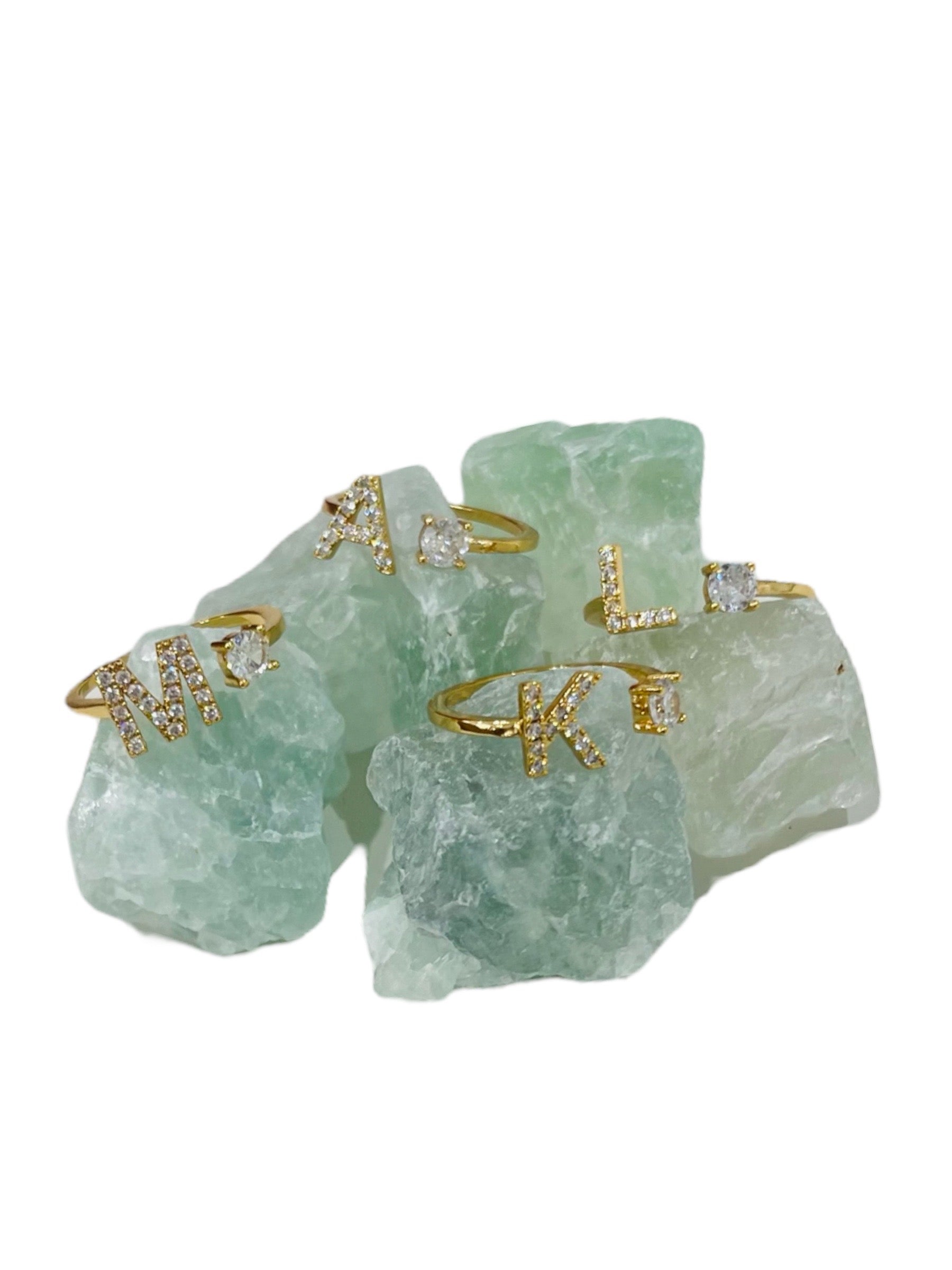 Initial of your choice in clear zirconias also a single zirconia. All Initial Rings are one size fits all and are adjustable to fit to any finger. These Initials Rings are great to stack or a perfect gift. Coated 18k Gold
