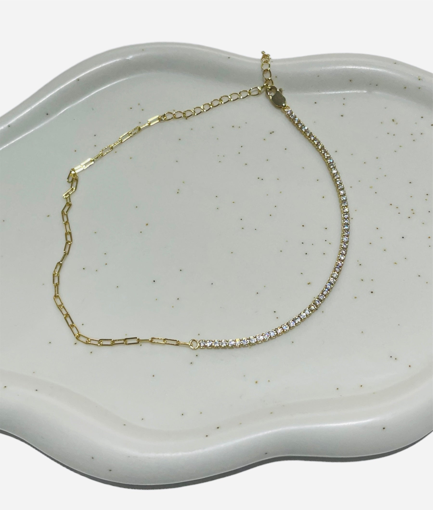 18k gold plated sterling silver anklet With half tennis zirconias half paperclip chain